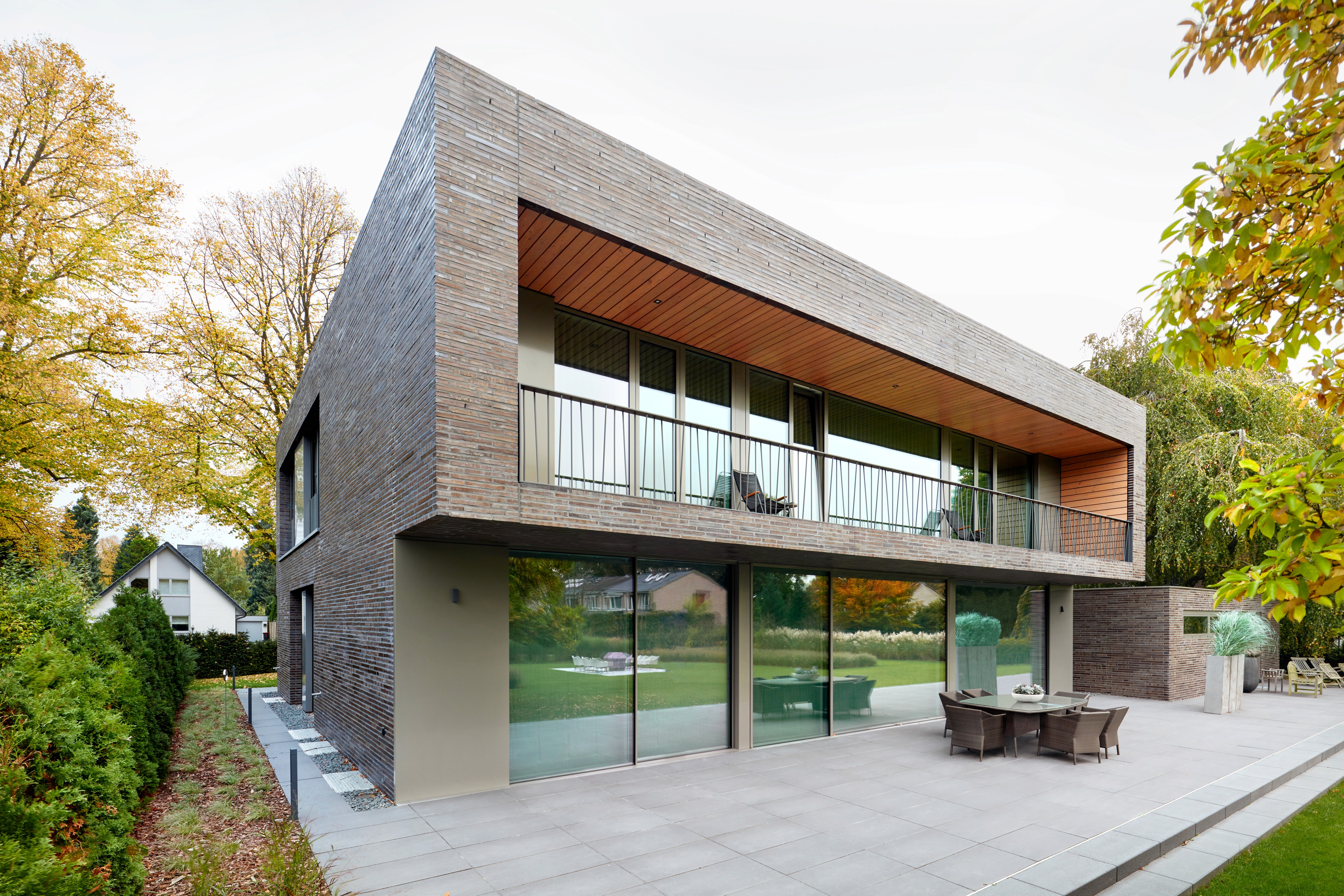Zur Straßenseite wird das Haus vollständig über die Fassade gelesen. Das Erdgeschoss ist mit einer vertikal profilierten Holzfassade ausgeführt, darüber liegt eine schwere, geschlossene Ziegelfassade. Diese wirkt gesetzt und ruhig, ohne dekorativ zu sein. Entscheidend war, dass das Klinkermauerwerk „sitzt“ – als präzise gefügtes Ganzes, nicht als bloße Hülle. Besonders anspruchsvoll war die Ausbildung der Vorderfassade. Vertikale Reihen von Vertiefungen verjüngen sich von der Mitte nach außen und nehmen schwarze Ziegel auf, die optisch wie Öffnungen wirken, ohne tatsächlich Löcher zu sein. Die Herausforderung lag darin, diese Elemente exakt übereinander im Lot zu halten und gleichzeitig ein stimmiges Fugenbild im restlichen Mauerwerk zu bewahren. Klassische Verbandsregeln reichten hier nicht aus. Das Langformat der Ziegel half, neue Lösungen zu entwickeln, ohne die Ruhe der Fläche zu verlieren. Der kritische Moment lag in der Ausführung dieser Fassadenseite. Hier entschied sich, ob das Gebäude seine gewünschte Selbstverständlichkeit bekommt oder unruhig wirkt. Die Fassade ist streng rechteckig, hat aber durch Proportion, Tiefe und Rhythmus eine fast sakrale Präsenz. Ein Fehler wäre sofort sichtbar gewesen. Neben der Fassade mussten auch Keller und Dach als weiße Wannen zuverlässig funktionieren. Beide waren früh definiert, das Dach stellte aufgrund der thermischen Belastung höhere Anforderungen. Die Ausführung erfolgte in enger Abstimmung mit spezialisierten Nachunternehmern. Die Zusammenarbeit mit Laket Architekten war eingespielt. Durch das gegenseitige Vertrauen konnten Details zügig abgestimmt und zahlreiche Ziegelfertigteile gemeinsam freigegeben werden, ohne den Prozess zu verlangsamen. Für den Architekten war das Ergebnis planbar – trotz der handwerklichen und konstruktiven Herausforderungen.