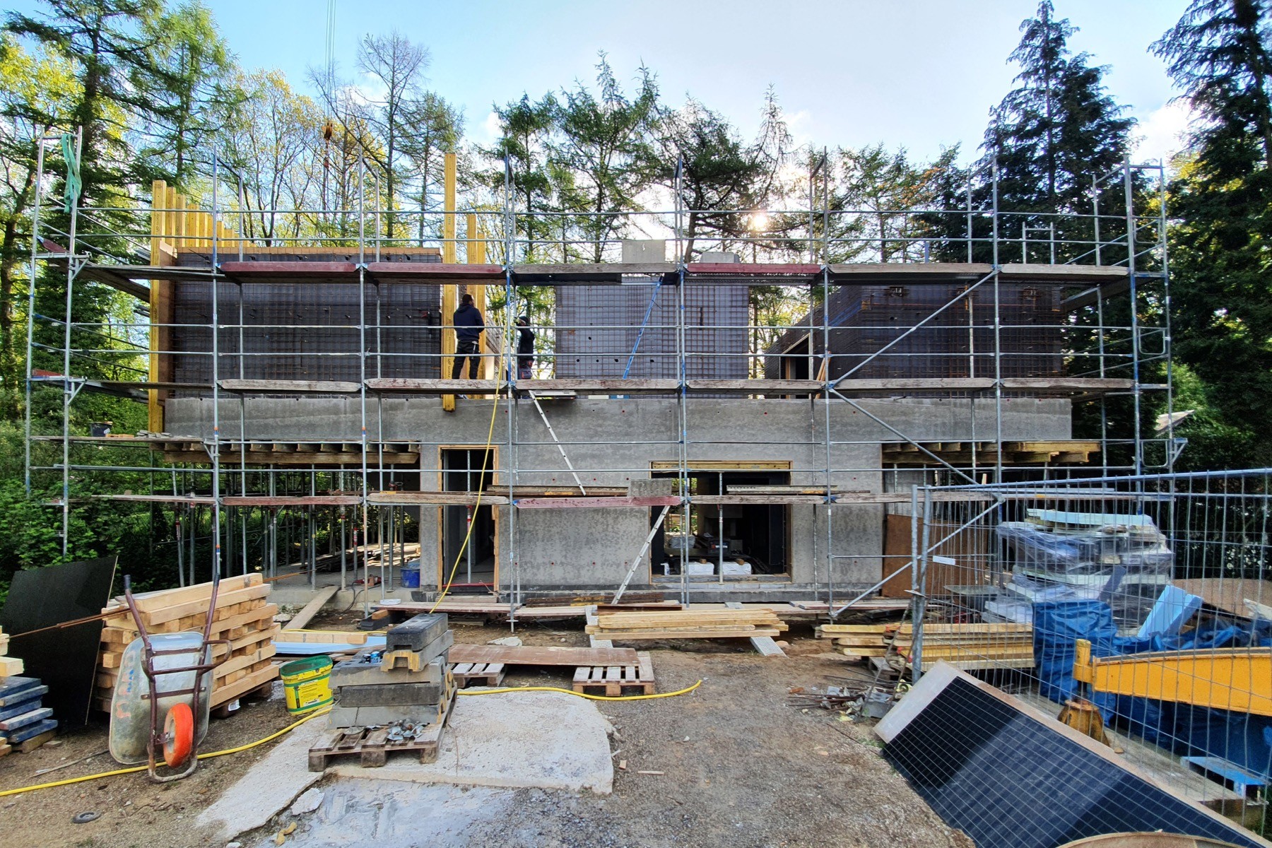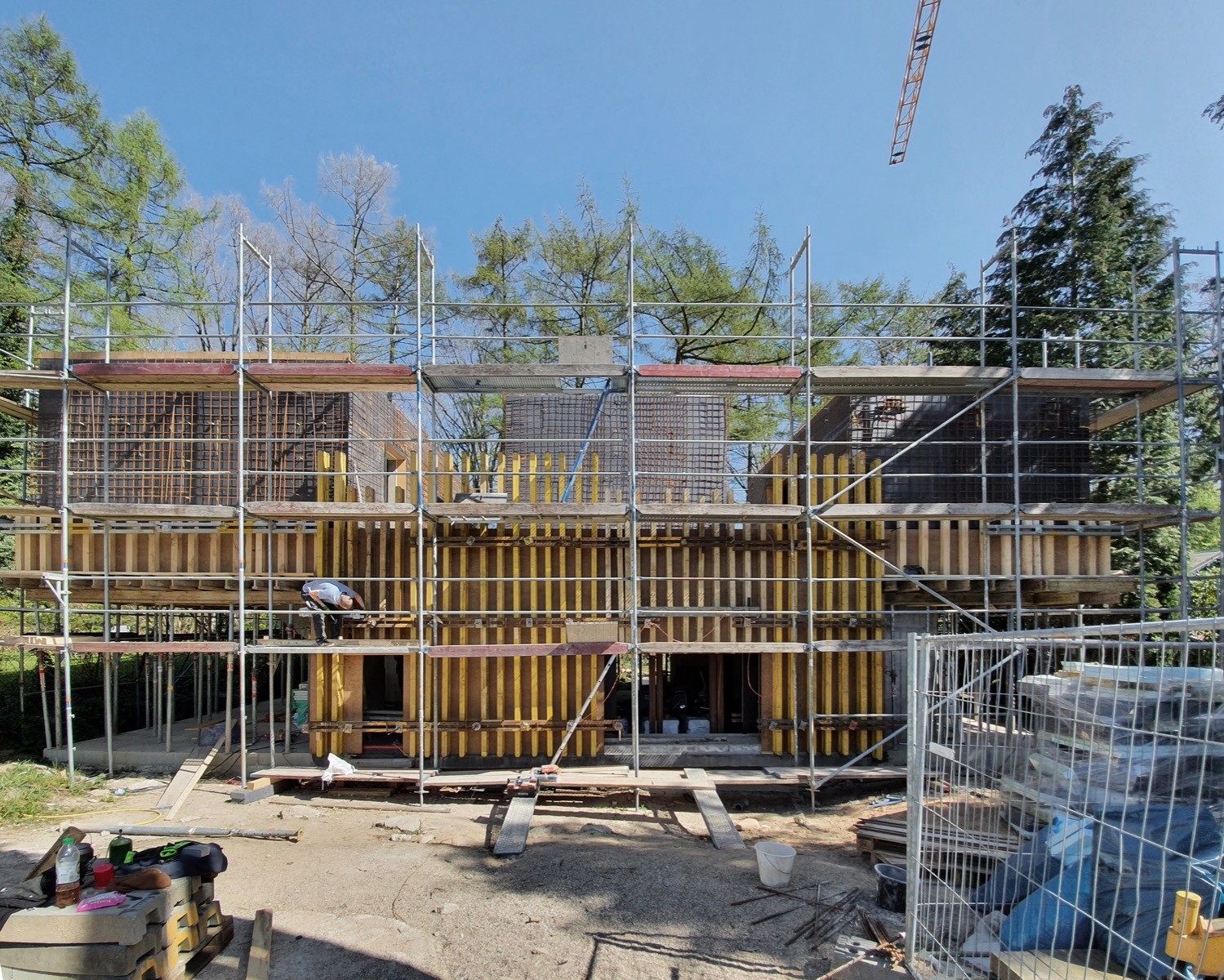 Die architektonische Idee war bewusst roh. Monolithische, gestapelte Kuben mit großen Glasflächen. Stumpfe, leicht ruppige Betonoberflächen. Gleichzeitig war die Erwartung an die Ausführung hoch: scharfe Kanten, plane Ebenen, ruhige Flächen. Trotz der rauen Anmutung durfte nichts zufällig wirken. Komplex wurde das Projekt durch die konstruktiven Anforderungen. Wärmeschutz und Abdichtung erforderten eine zweischalige Bauweise mit Kerndämmung. Die Außenschale wurde nachträglich hergestellt, teilweise über zwei Geschosse hinweg. Schalungsanker sollten innen und außen logisch aufeinander abgestimmt sein. Arbeitsfugen mussten präzise gesetzt werden, damit sie im fertigen Zustand lesbar, aber nicht störend sind. Die Konstruktion sollte am Ende monolithisch wirken, obwohl sie es technisch nicht war. Wir wurden in einer frühen Phase angesprochen, noch bevor das Leistungsverzeichnis final festgelegt war. Das ermöglichte, verschiedene Schalungslösungen offen zu halten und ausführungskritische Punkte vorab zu klären. Gemeinsam mit den Architekten entwickelten wir die komplette Schalungslogik für Innen- und Außenflächen, stimmten das Schalbild ab und definierten die Betonsorten. Ein entscheidender Moment war die Frage, wie die Fassade geschalt werden sollte. Aus Kostengründen stand zur Diskussion, auf eine einfachere Systemschalung zu wechseln. Nach intensiver Abwägung entschieden wir uns bewusst dagegen und empfahlen, die bisher eingesetzten Westag RS Special großformatigen Platten einzusetzen, diesmal aber als Trägerschalung mit H20-Trägern und Stahlriegeln. Rückblickend war das eine zentrale Entscheidung. Eine kleinteilige Schalungsoptik hätte die Wirkung der Fassade grundlegend verändert. Die größte Herausforderung lag darin, für jede technische Anforderung eine projektspezifische Lösung zu finden. Viele davon waren Einzellösungen. Entsprechend hoch war das Risiko, dass das Ergebnis nicht der ursprünglichen Idee entspricht. Umso klarer war für uns, dass insbesondere die Vorderfassade stimmen musste. Hier floss ein erheblicher Teil der Planungsarbeit. Im fertigen Zustand ist die konstruktive Komplexität kaum ablesbar. Die zweischalige Bauweise tritt zurück, Fensterleibungen aus Sichtbeton überdecken die Dämmebene. Das Gebäude wirkt ruhig und selbstverständlich, als wäre es aus einem Stück gebaut.